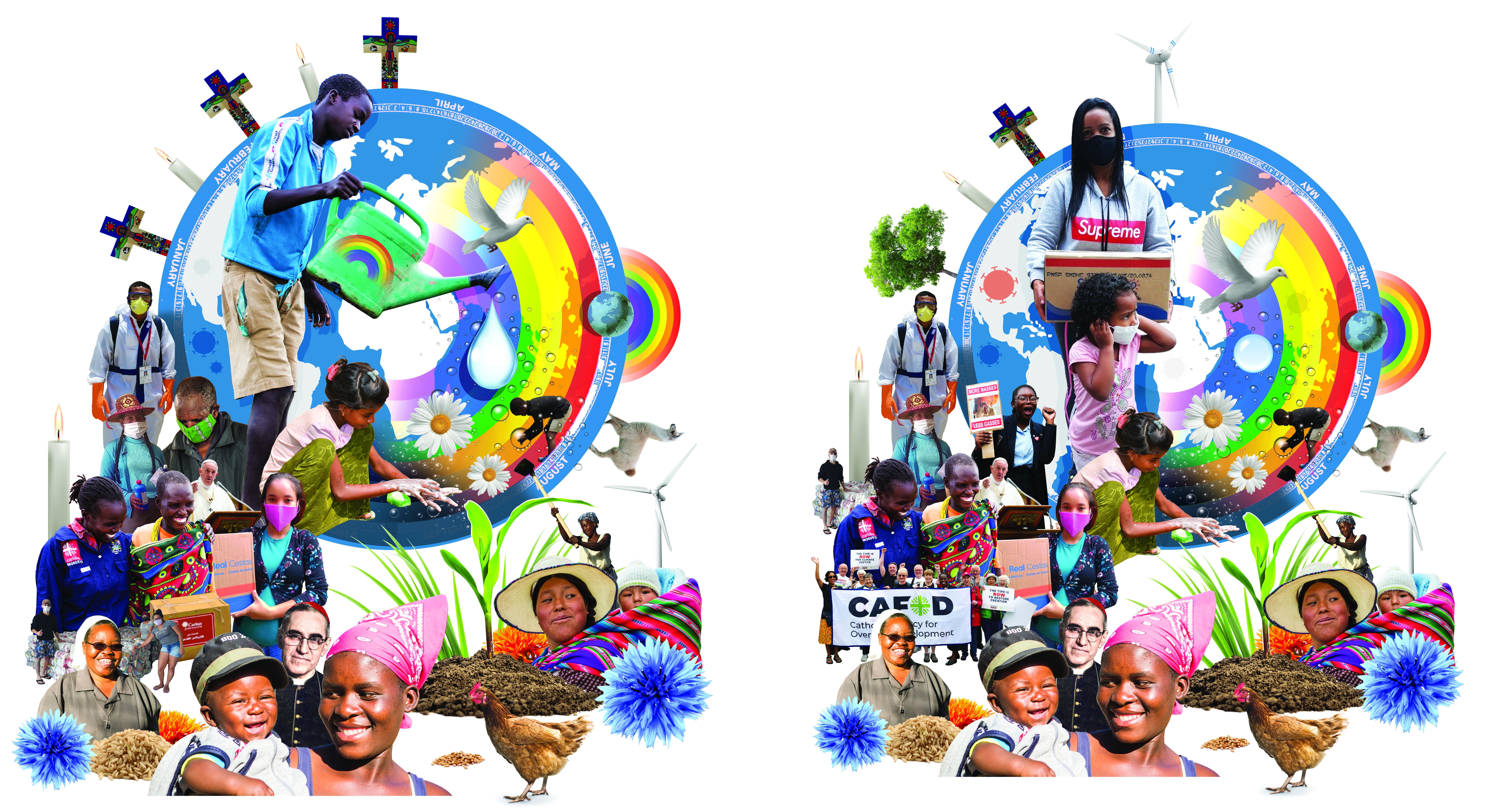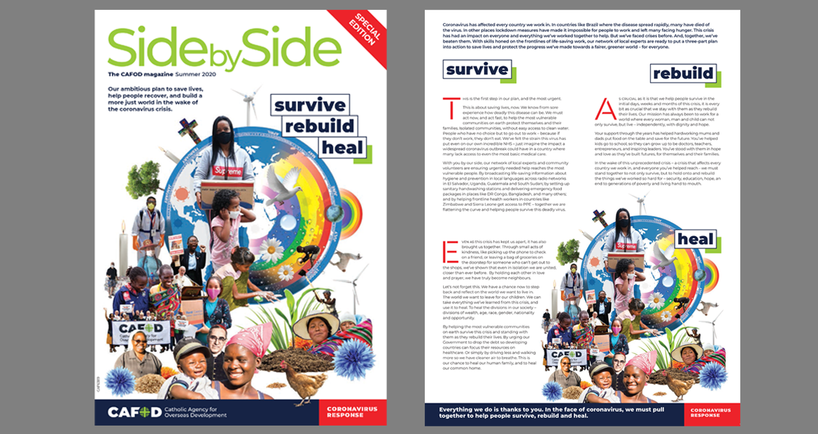 Photomontage llustration for CAFOD Side by Side magazine about how the charity is trying help the third world cope and help with the effects of the Coronavirus pandemic.